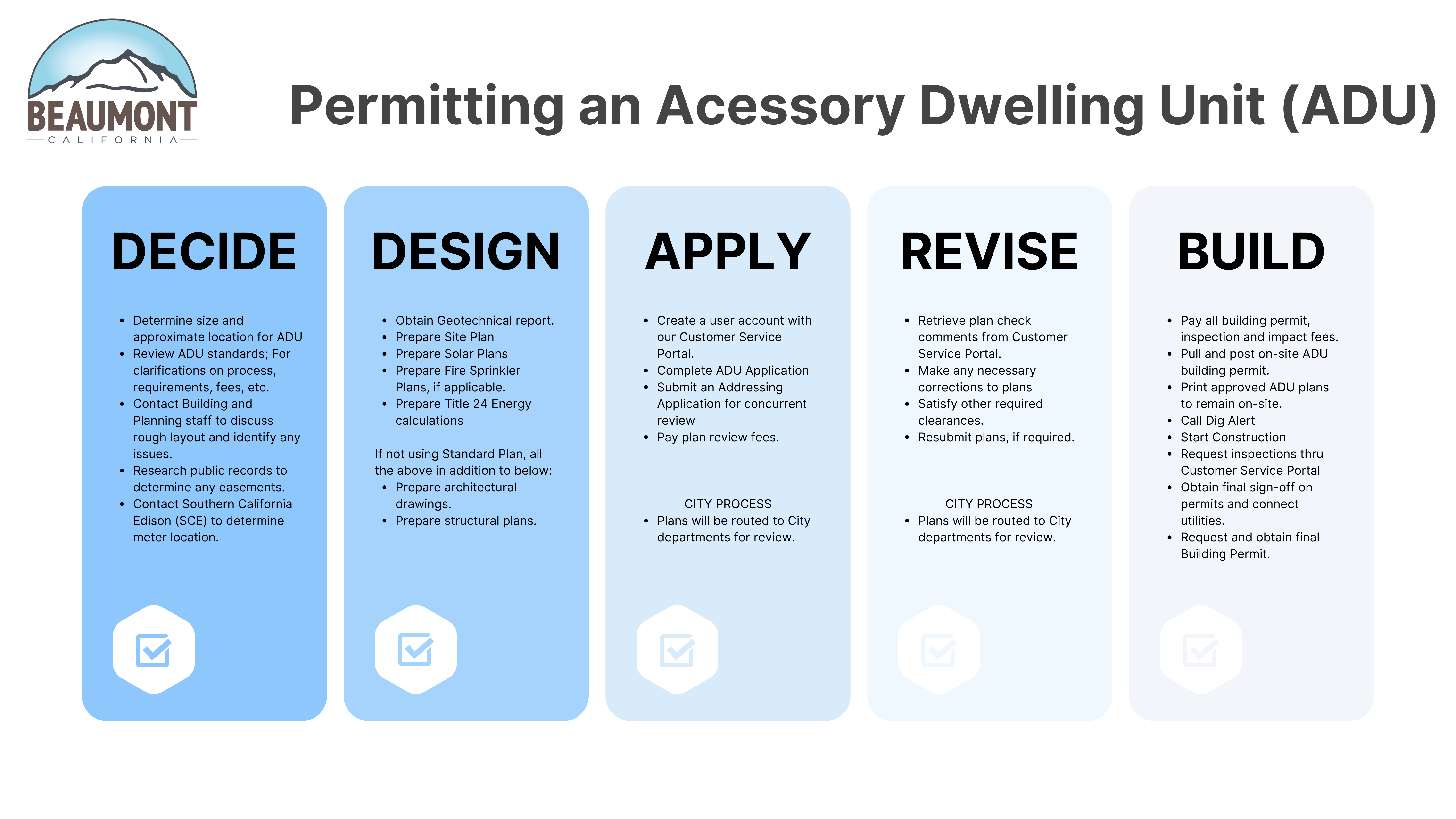 The information provided in this page identifies the City of Beaumont's current regulations for Accessory Dwelling Units (ADUs) and Junior Accessory Dwelling Units (JADUs).  Begin with identifying the type of ADU proposed and then refer to the pertinent development standards and regulations for that category. Then, refer to the bottom of this page for additional regulations applicable to all ADUs and JADUs.