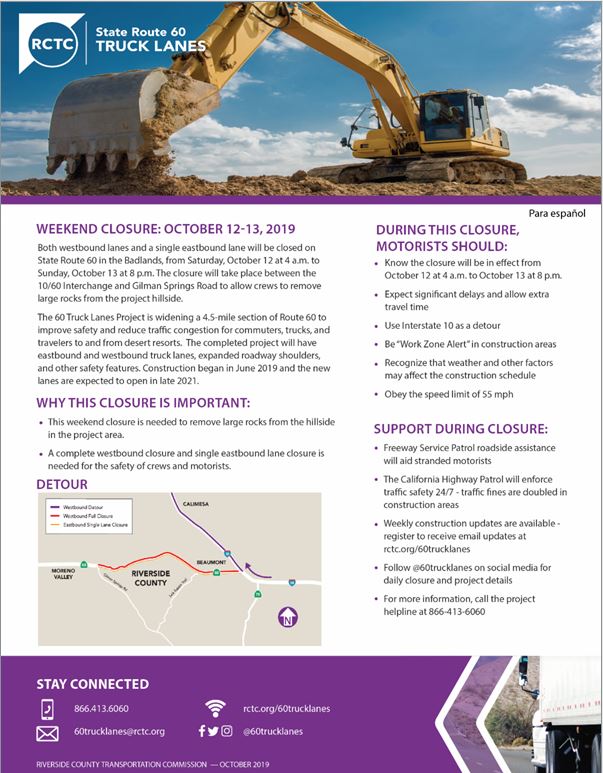 Both westbound and a single eastbound lane will be closed on State Route 60 in the Bandlands, from Saturday, October 12 at 4 a.m. to Sunday, October 13 at 8 p.m. The closure will take place between the 10/60 Interchange and Gillman Springs Road to allow crews to remove large rocks from the project hillside.